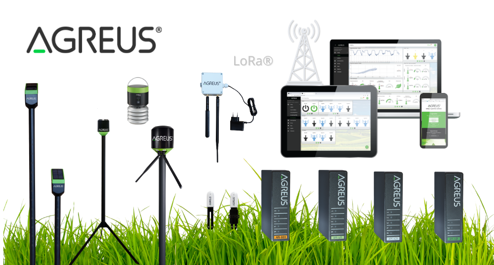 AGREUS® is a wireless system for monitoring and controlling agrotechnical processes. Based on LoRa® technology, it allows data to be collected from fields, analysed in a web or mobile application, and used to automatically control devices – from irrigation valves to wind machines, mixers, lighting, pumps, etc. This gives farmers insight into crop conditions and allows them to respond in real time to sudden problems related to crop conditions.