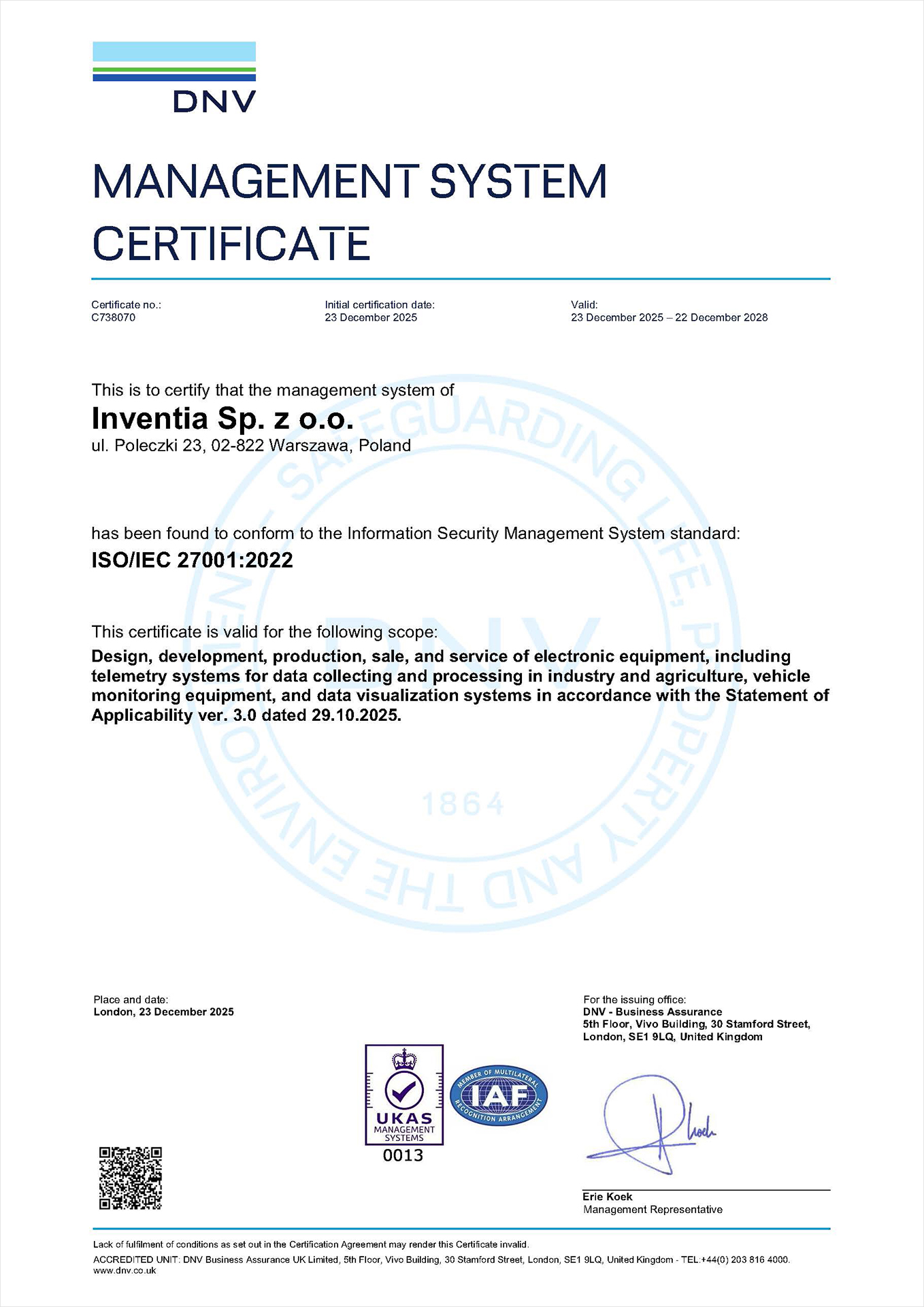 In the era of IoT, advanced digitalisation and regulations such as NIS2 and CRA, information security is a key element of responsible cooperation. ISO/IEC 27001 enables systematic risk management and ensures that our processes, services and products meet the highest international standards.