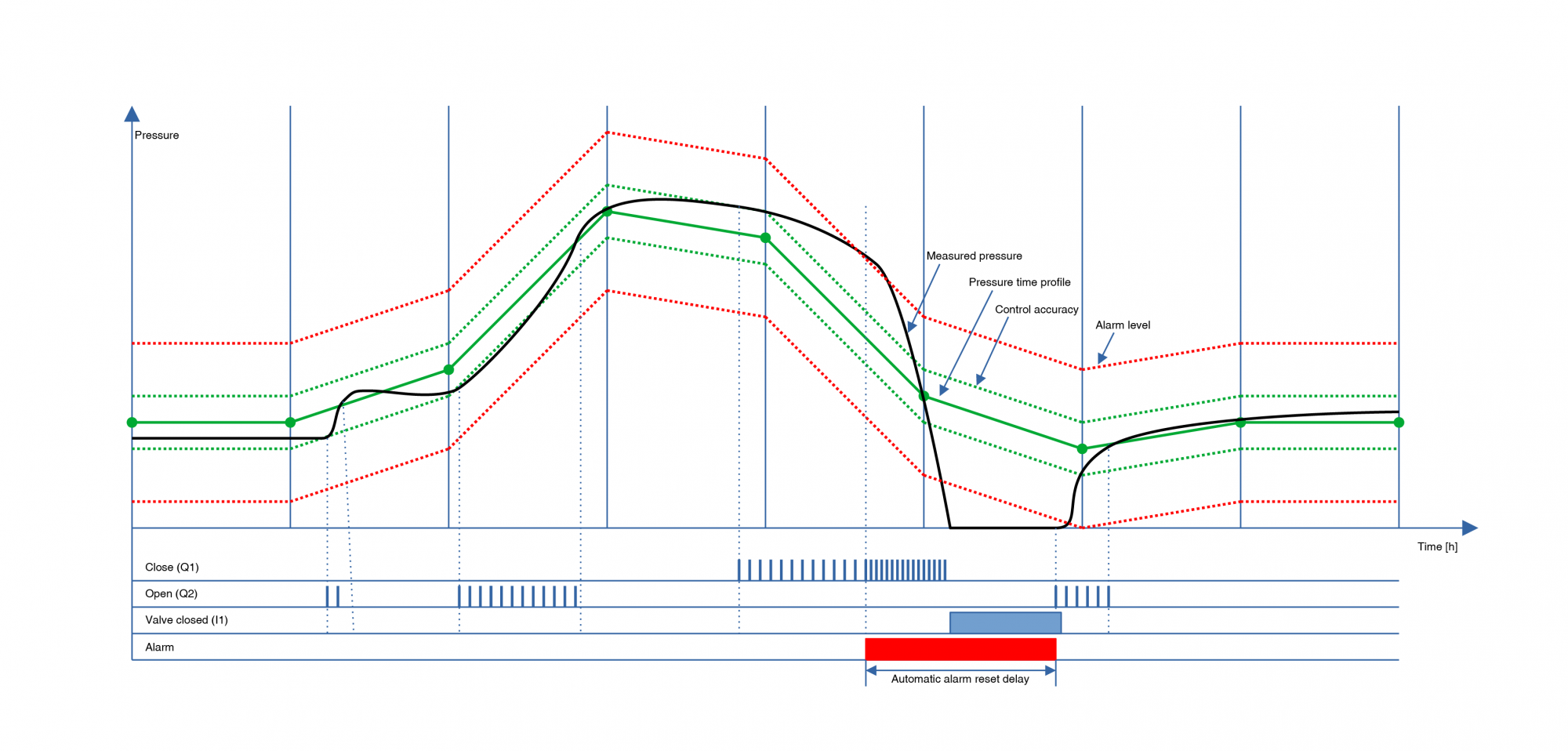 In both modes, the device uses control tables that define the desired pressure value as a function of time or flow. The regulator calculates intermediate points linearly between the set values, which allows for smooth pressure adjustment.