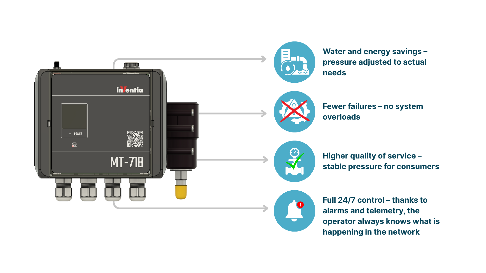 One of the most advanced devices of this type is the MT-718 – a telemetry module in an IP68 enclosure, which, thanks to built-in PRV algorithms, acts as an intelligent pressure regulator.
