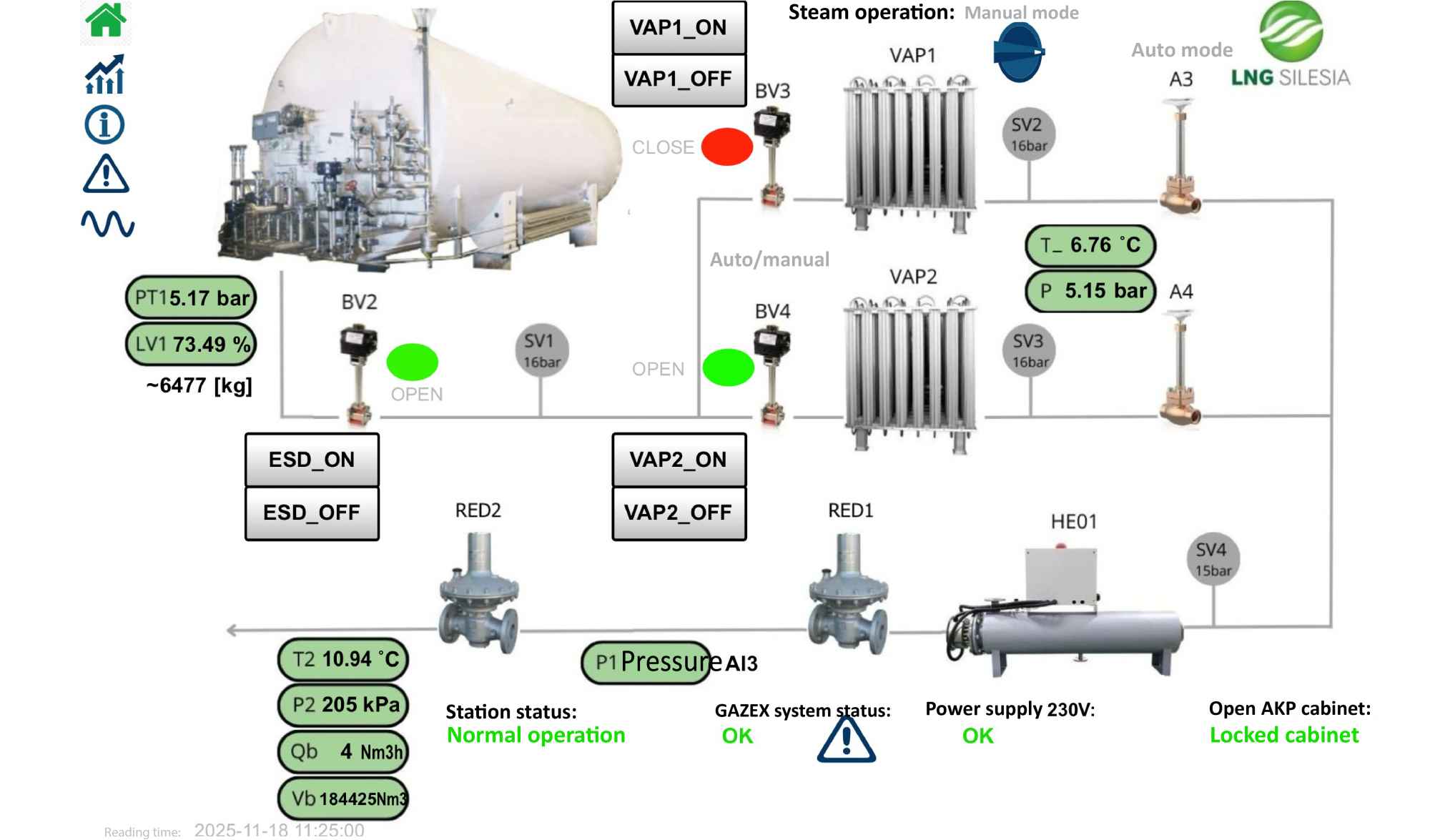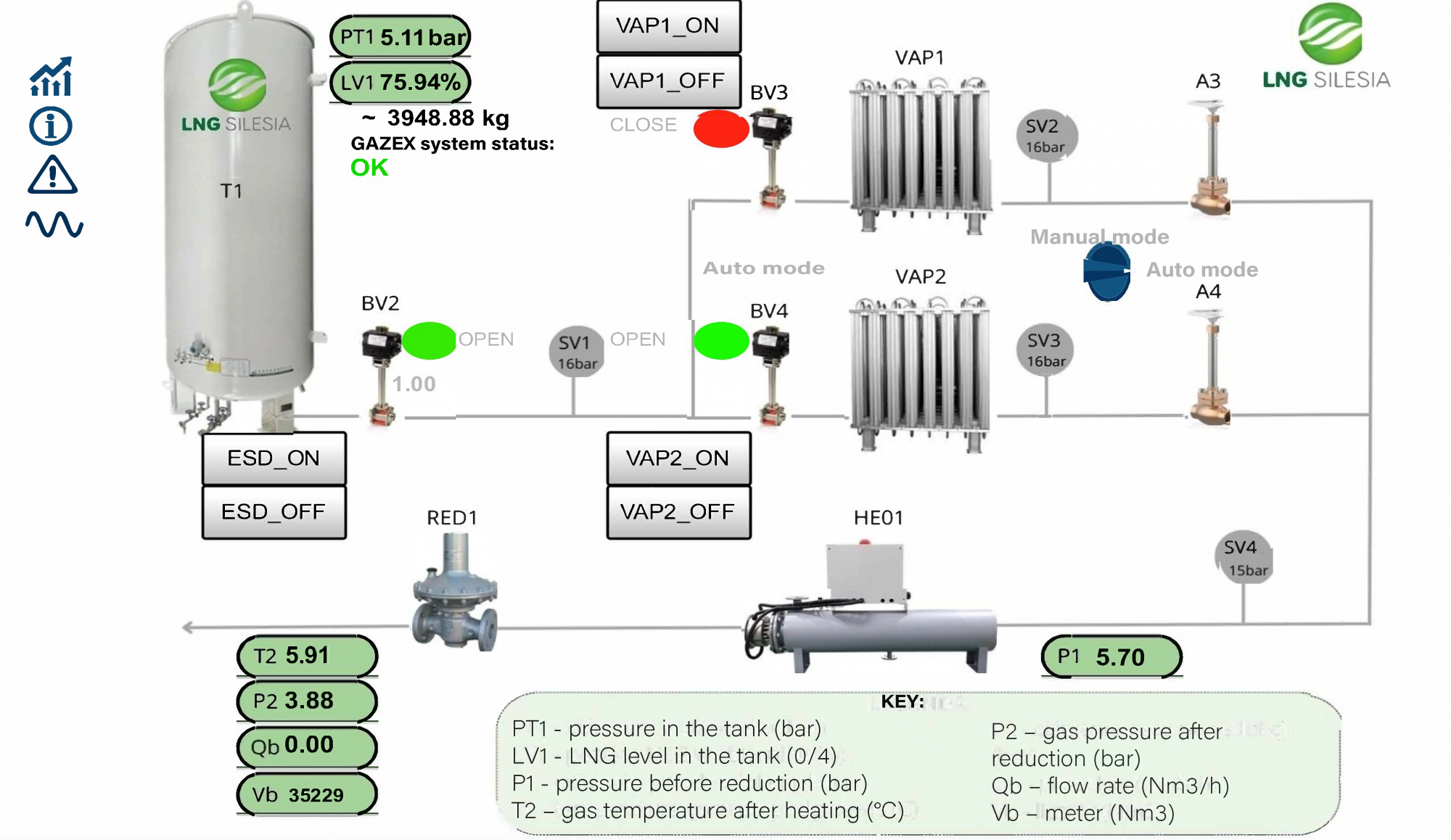 The MT-121-based system records and analyses relevant parameters of the LNG regasification process using signals from devices manufactured by reputable manufacturers. The level and pressure in the LNG tank are monitored mainly by SAMSON MEDIA 6SAMSON MEDIA 7 and Rosemount  3051 transducers/level indicators, which ensure high accuracy of indirect measurements of the LNG level in the tank.
