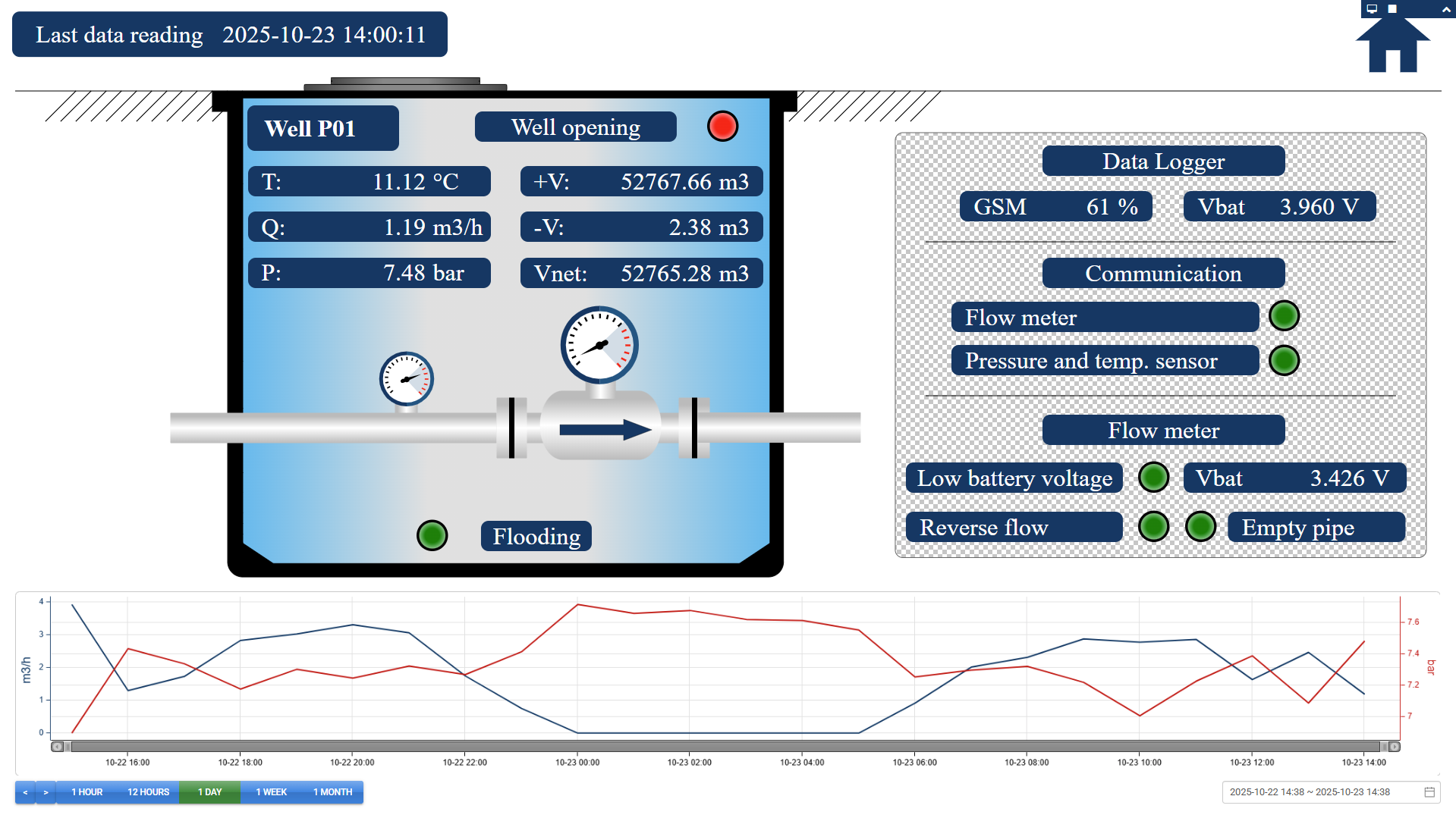 The system also includes sensors that signal well flooding and manhole opening. The flow meter reads parameters such as empty pipe signalling, low battery status, reverse flow, forward, reverse and net flow meters, as well as current flow rate.